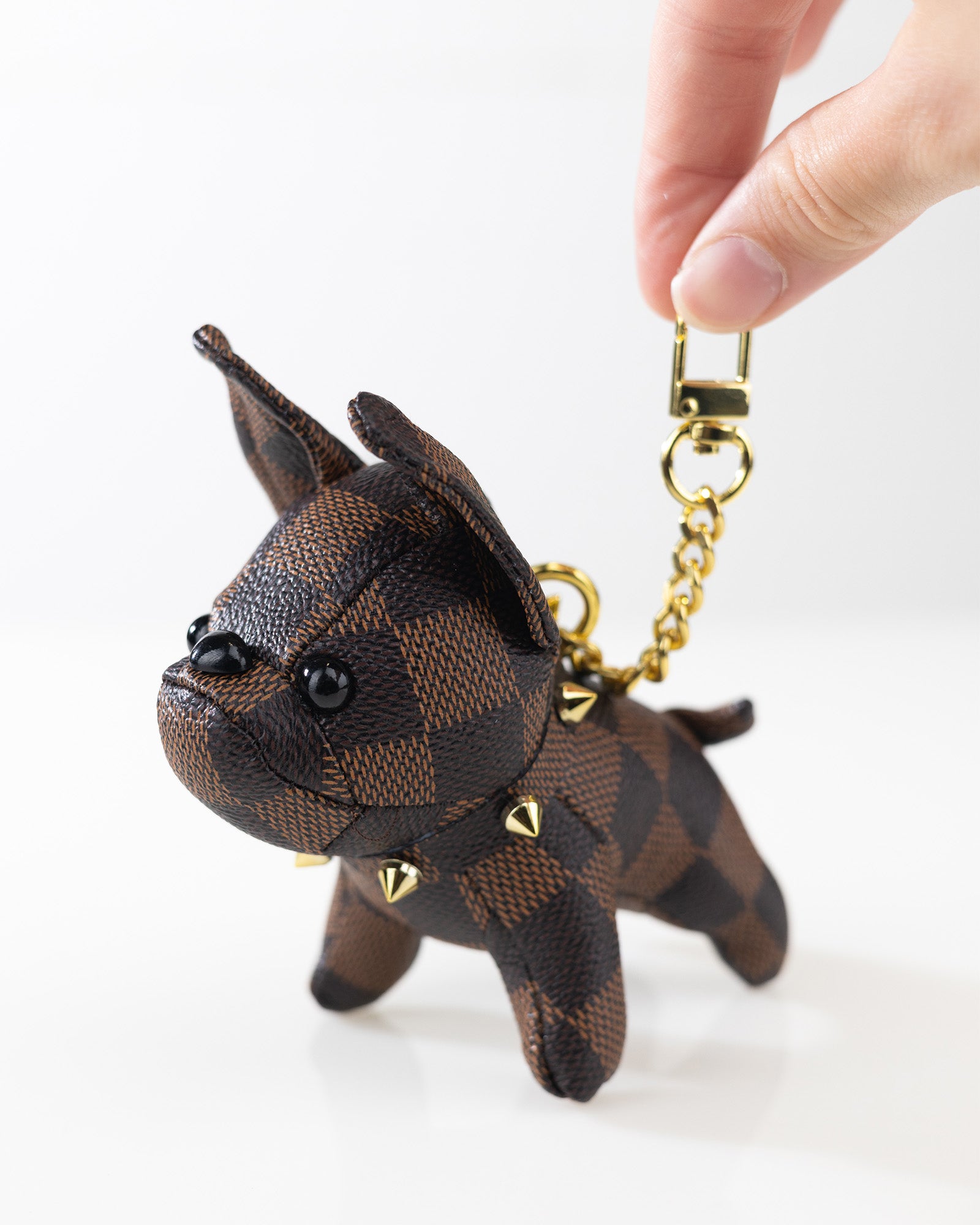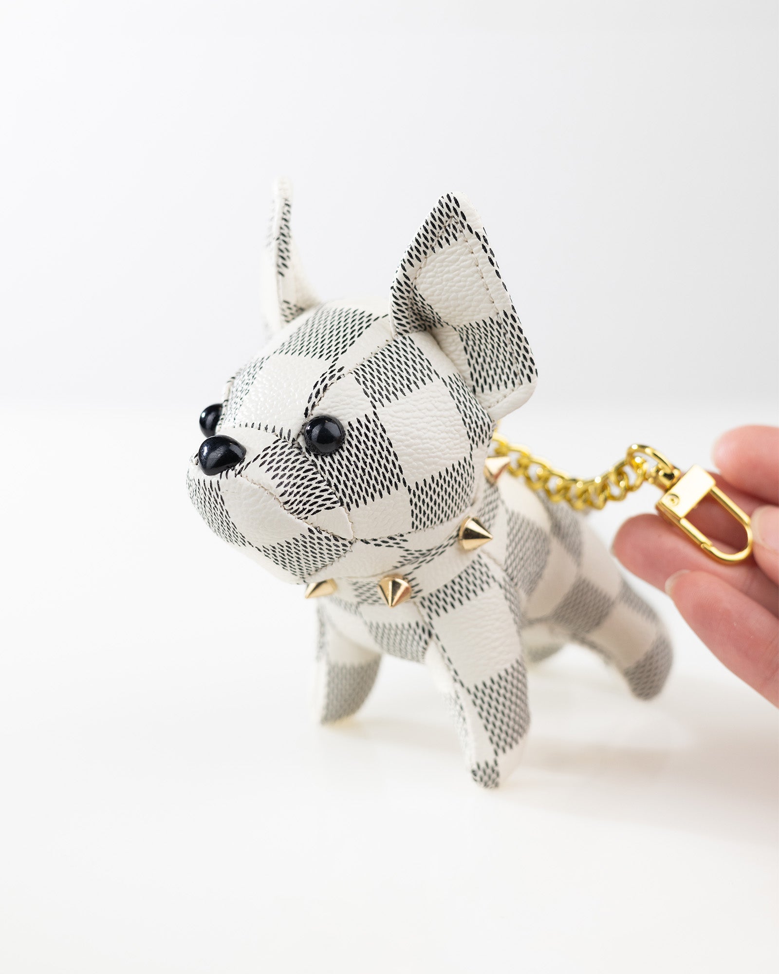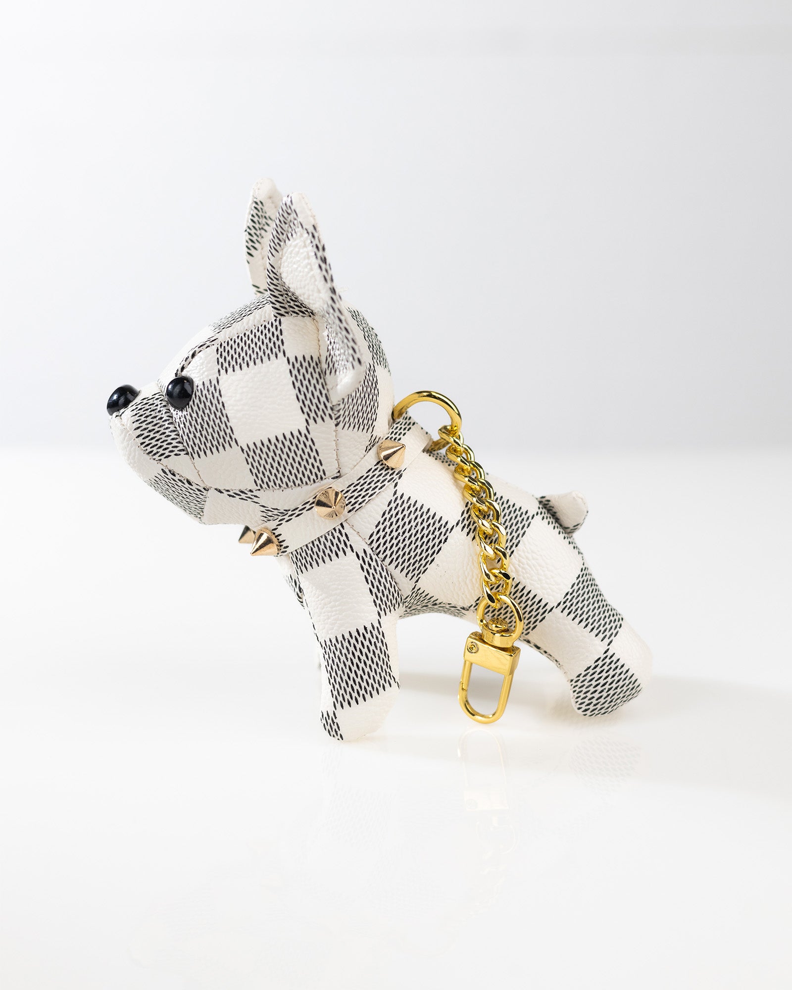 Gefertigt aus hochwertigem PU-Leder mit klassischem Karo-Muster und ausgestattet mit einer goldfarbenen Gliederkette und Karabiner, ist dieser Taschenanhänger ein echter Hingucker und das perfekte Accessoire für Tierliebhaber und Modebewusste.