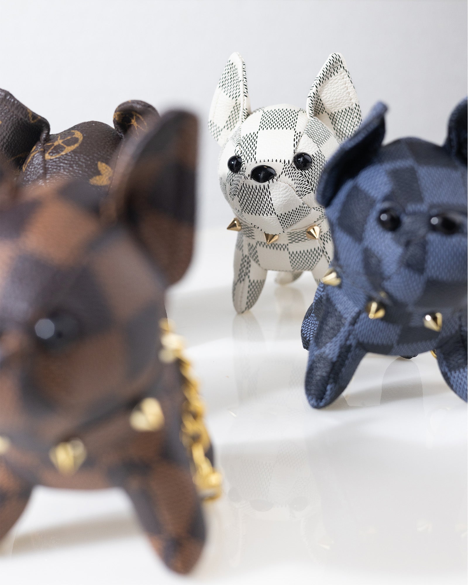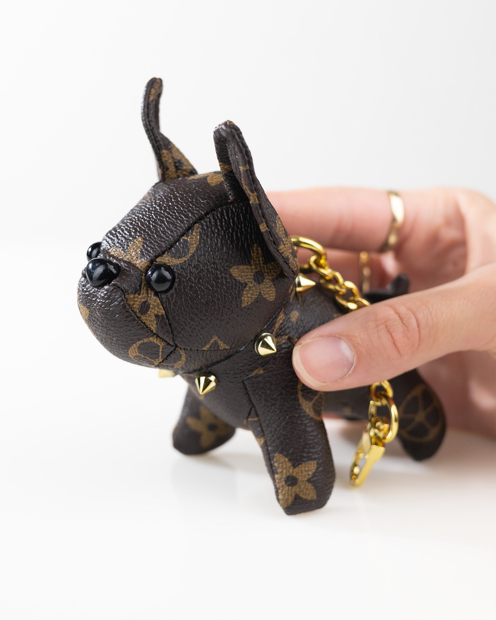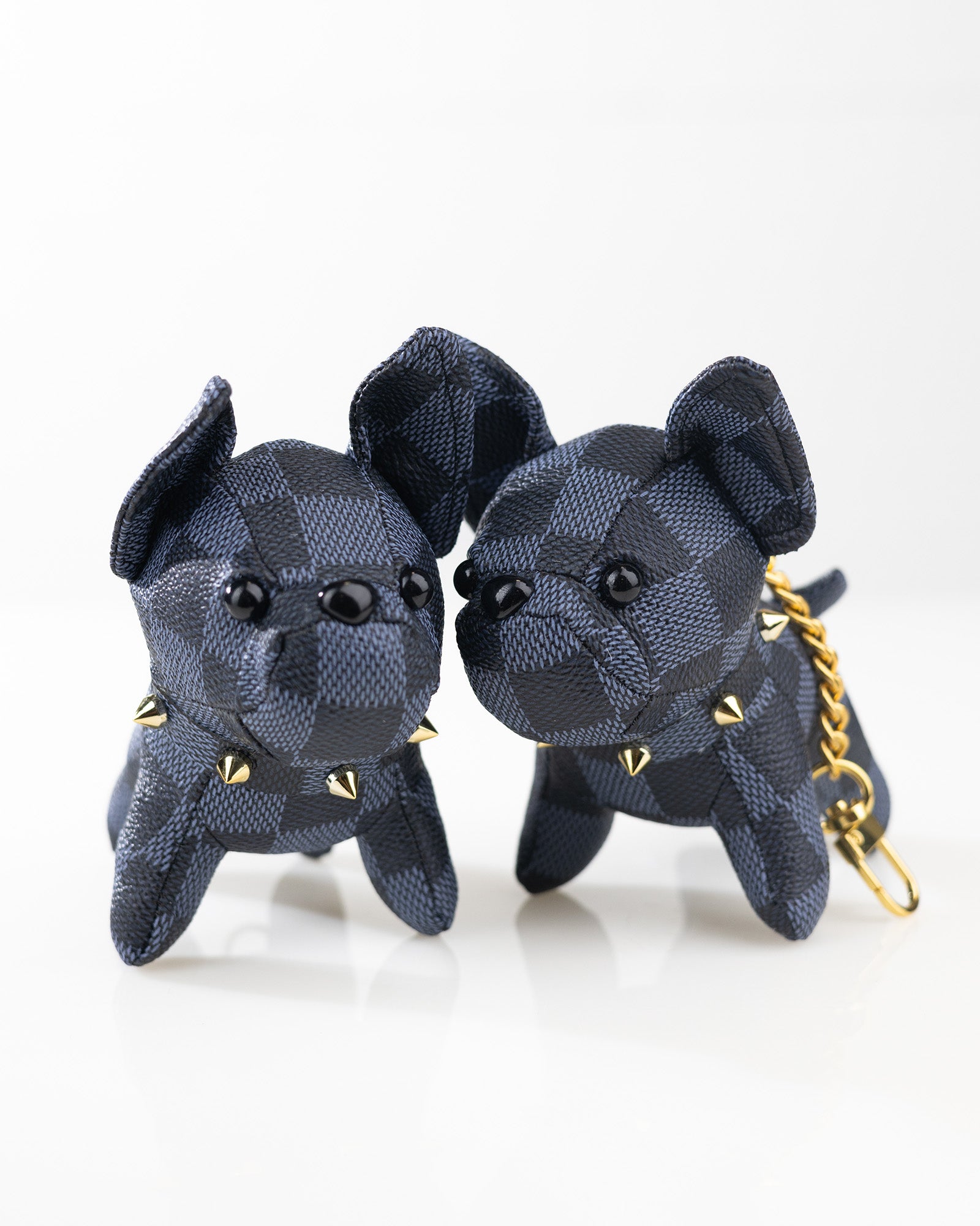 Gefertigt aus hochwertigem PU-Leder mit klassischem Karo-Muster und ausgestattet mit einer goldfarbenen Gliederkette und Karabiner, ist dieser Taschenanhänger ein echter Hingucker und das perfekte Accessoire für Tierliebhaber und Modebewusste.